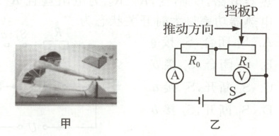 13. (2024 泰州)如图甲所示是进行“坐位体前屈”体质测试的情景.小华所在项目化学习小组设计了一个功能相似的测试模型,其原理电路如图乙所示,电源电压 6 V 不变,$R_0$的阻值为 30 Ω,电阻$R_1$用总长为 30 cm、粗细均匀的电阻丝制成(其电阻与长度成正比),挡板初始位置在$R_1$最左端.闭合开关,向右推动挡板的过程中,电流表示数