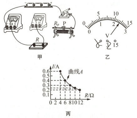 .②根据所测的五组实验数据,把每次实验时记录的电流值和对应变阻器$R_P$的阻值,在图丙坐标系中描成点,将这些点绘成曲线B,发现曲线B与曲线A