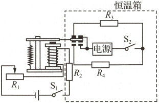 (填“大于”或“小于”)$R_4$阻值.(3) 将$R_1$的阻值稍微调小一些,恒温箱控制的温度将