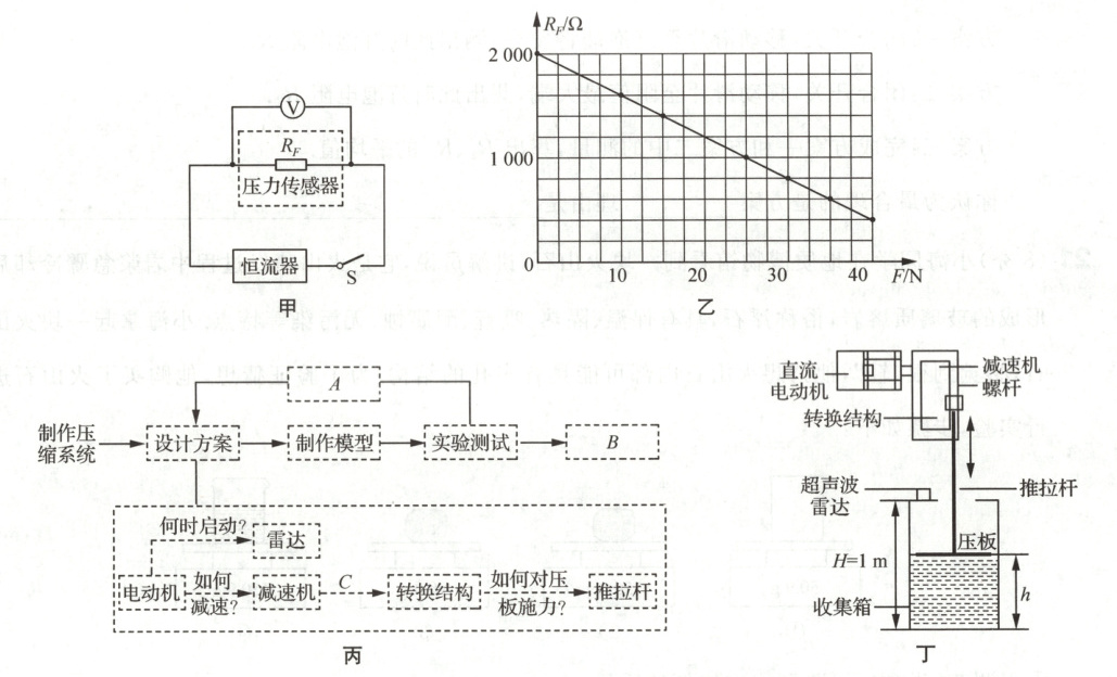 (5)若要使模型中的称重装置测量更精确,压力一定时电阻一定,故可以增大恒定的电流;对模型的设计提出的改进措施是:答案一:利用太阳能发电系统,为模型提供电力需求;(节能环保类) 答案二:设置保护开关,保证电动机功率保持在安全范围,不至于烧毁;(安全用电类) 答案三:设计垃圾桶侧面投送窗口,保证垃圾不受压板阻挡;(设计工艺类) 答案四:利用红外装置等,设计自动识别可回收物的种类;利用人工智能,将回收物的质量转化为积分奖励学生等.(智能创新类)(其他合理答案均给分)