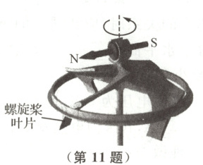 11 如图所示是目前世界上能实现可控飞行的最小无线机器人.该机器人由两个部分组成,一个部分是用3D打印出来的主体结构,由四个螺旋桨叶片和一个平衡环组成,质量为$14.7\ \mathrm{mg}$;另一部分是小永磁体,质量为$6.3\ \mathrm{mg}$.根据设计的飞行路径,向机器人发射电磁波,在变化的磁场作用下,小永磁体被吸引或排斥,带动螺旋桨旋转并产生足够升力,让机器人完成离地飞行、悬停等动作.下列说法错误的是($g$取$10\ \mathrm{N/kg}$)