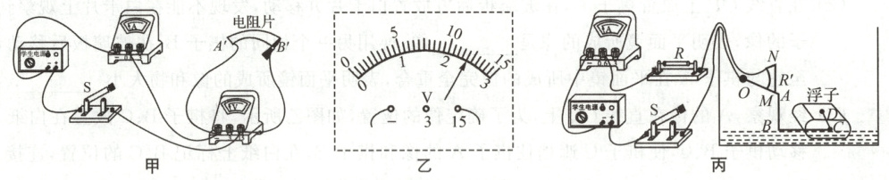 (1)由图乙可知,电压表的量程为0~15V,分度值为0.5V,示数为12V;图甲电路为电阻片的简单电路,则电源电压为12V。当该位置到$A^{\prime}$端的阻值为40$\Omega$时,根据欧姆定律可知,电路中的电流$I=\frac{U}{R}=\frac{12V}{40\Omega}=0.3A$,即电流表示数为0.3A。