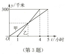 3. 甲、乙两车从 A 城出发匀速行驶至 B 城.在整个行驶过程中,甲、乙两车离开 A 城的距离$y$(千米)与甲车行驶的时间$t$(小时)之间的函数关系如图所示.则下列结论: