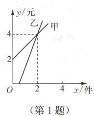 1. 如图,是甲、乙两家商店销售同一种产品的销售价$ y$(元)与销售量$x$(件)之间的函数图象.下列说法:①售 2 件时甲、乙两家售价一样;②买 1 件时买乙家的合算;③买 3 件时买甲家的合算;④买乙家的 1 件售价约为 3 元,其中正确的说法是 (