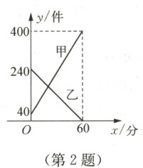 2. 某快递公司每天上午$9:00\sim10:00$为集中揽件和派件时段,甲仓库用来揽收快件,乙仓库用来派发快件,该时段内甲、乙两仓库的快件数量$y$(件)与时间$x$(分)之间的函数图象如图所示,那么当两仓库快递件数相同时,此刻的时间为 (