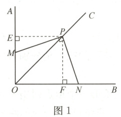 (1) 如图 1,若 $\angle AOB = 90^{\circ}$,$\angle MPN = 90^{\circ}$,过点 $P$ 作 $PE\perp OA$ 于点 $E$,作 $PF\perp OB$ 于点 $F$,请判断 $PM$ 与 $PN$ 的数量关系,并说明理由;