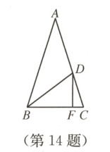 14. 如图,在$\triangle ABC$中,$AB = AC$,点$D$在$AC$上,过点$D$作$DF \perp BC$于点$F$,且$BD = BC = AD$,则$\angle CDF$的度数为$\boldsymbol{$
