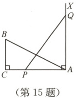 15. 如图,在$Rt\triangle ABC$中,$\angle C = 90°$,$AC = 10\ cm$,$BC = 5\ cm$,一条线段$PQ = AB$,$P$,$Q$两点
