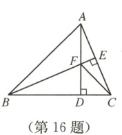 16. 如图,在$\triangle ABC$中,$AD$,$BE$分别为$BC$,$AC$边上的高,$AD$,$BE$相交于点$F$,$AD = BD$,连接$CF$,则下列结论:① $BF = AC$;② $CF \perp AB$;③ 若$BF = 2EC$,则$\triangle FDC$的周长等于$AB$的长;④ $\angle FCD = \angle DAC$,其中正确的有$\boldsymbol{$