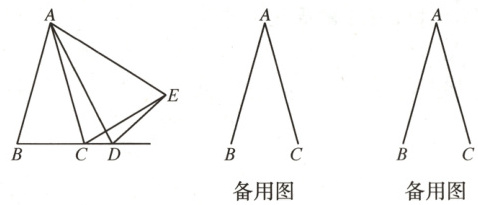 22. (16分)在$\triangle ABC$中,$AB = AC$,$D$是直线$BC$上一点,以$AD$为一条边在$AD$的右侧作$\triangle ADE$,使$AE = AD$,$\angle DAE = \angle BAC$,连接$CE$。设$\angle BAC = \alpha$,$\angle DCE = \beta$。