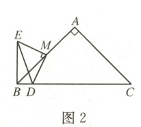 【类比再探】如图 2,在△ABC 中,∠BAC = 90°,AB = AC,点 M 是 AB 上一点,点 D 是 BC 上一点,连接 MD,以 MD 为一边作△MDE,使∠DME = 90°,MD = ME,连接 BE,则∠EBD =