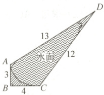 3. 如图,某风景区的沿湖公路$AB = 3$千米,$BC = 4$千米,$CD = 12$千米,$AD = 13$千米,其中$AB\perp BC$,图中阴影是草地,其余是水面.那么乘游艇从点$C$出发,行进速度为每小时$11\frac{7}{13}$千米,到达对岸$AD$最少要用