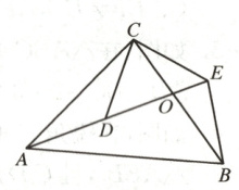 2. 如图,$\triangle ACB$和$\triangle DCE$均为等腰三角形,点$A$,$D$,$E$在同一条直线上,$BC$和$AE$相交于点$O$,连接$BE$,若$\angle CAB = \angle CBA = \angle CDE = \angle CED = 50^{\circ}$.