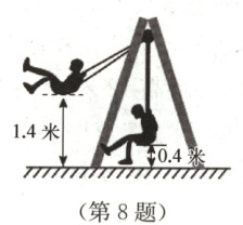 8. 如图,一小孩在荡秋千,秋千的纤绳长为$2$米,当小孩在最低位置时,秋千底部距离地面$0.4$米,当小孩达到最大高度时,秋千底部距离地面$1.4$米,那么小孩从最低位置达到最大高度位置,秋千底部所经过的路径长为
