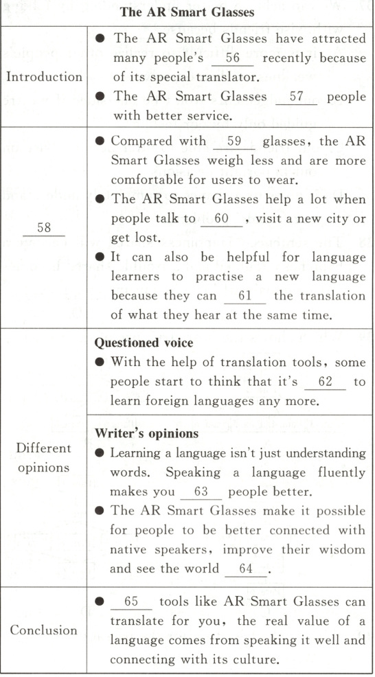 60. foreigners 根据第四段第二、三句可知,AR 智能眼镜在人们与“外国人”交谈、游览新城市或迷路时帮助很大。
