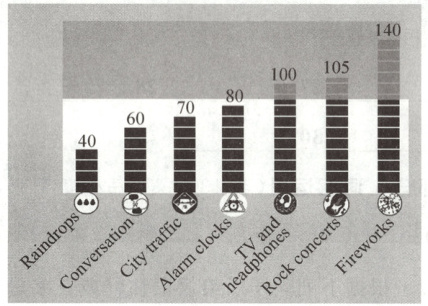 Sounds are measured(测量) in decibels(分贝). Look at the chart—some sounds are safe for our ears, but when a sound goes over 85 decibels, it can be harmful to our hearing. To reduce the risk of hearing loss, we shall pay attention to the loudness of the noise, the distance we are to it and how long we listen to it.
