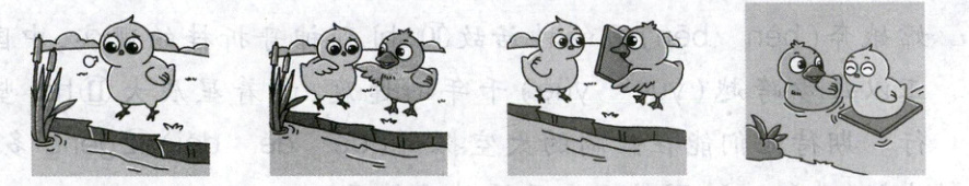 请你认真观察下面四幅图,想一想:小鸡要去哪里?路上遇到了什么困难?小鸭是怎么帮助小鸡的?结果怎么样?用通顺的语句把故事写下来。