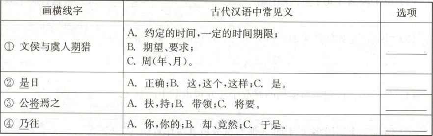 (1) 根据古汉语常用字字典,请结合语境给画横线的字选择恰当的解释,将序号填入选项。