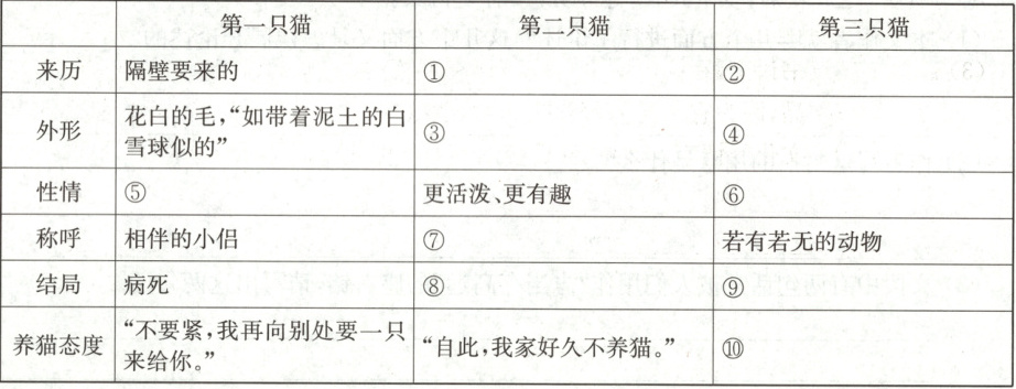 ①舅舅家抱来的 ②张婶捡来的 ③浑身黄色,更活泼有趣 ④毛色花白,不好看,很瘦 ⑤活泼 ⑥忧郁、不活泼 ⑦亲爱的同伴 ⑧被人捉走 ⑨被“我”打伤致死 ⑩永不养猫
