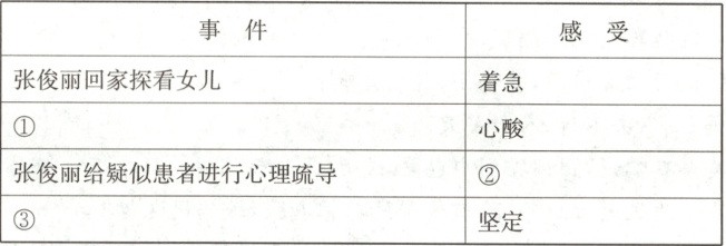 (1)①张俊丽面对家庭困境(或想到亏欠家人);②欣慰(或温暖);③张俊丽写下请战书并按下鲜红指印