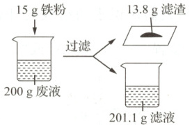 15.D 由质量守恒定律知,产生H₂的质量=15g+200g-201.1g-13.8g=0.1g,A正确;由Fe~H₂知,生成0.1gH₂消耗的Fe的质量=$\frac{56}{2}×0.1g=$2.8g,置换的Cu与消耗的Fe质量差Δm=13.8g-(15g-2.8g)=1.6g,由Fe~Cu~Δm知,置换的Cu的质量=$\frac{64}{8}×1.6g=12.8g$,生成12.8gCu消耗的Fe的质量=$\frac{56}{8}×1.6g=11.2g$,消耗的Fe的总质量=11.2g+2.8g=14g<15g,则滤渣中剩余1gFe,滤液中无H₂SO₄和CuSO₄剩余,FeSO₄溶液呈浅绿色,B正确;由上述分析知,滤渣中含有1gFe和12.8gCu,是Fe和Cu的混合物,C正确;由Fe~FeSO₄知,滤液中FeSO₄的质量=$\frac{152}{56}×14g=38g$,D错误。