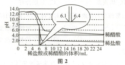 (7) 向两份等体积、等浓度的 NaOH 溶液中分别滴入一定量的稀盐酸和稀醋酸,其 pH 变化如图2所示,表明稀盐酸不宜用来调节水洗液的 pH。你对该疑问的解答是