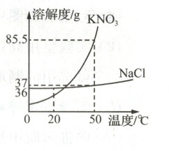 (4)m₁=10g-7.2g=2.8g,20mL水中溶解的KNO₃的质量小于NaCl的质量,则m₂>2.8g,故m₁<m₂,A错误;溶液a、b中溶质的质量分数不相等,B错误;根据A项分析可知,溶液b冷却至20℃,一定会有固体析出,C正确;50℃时,20mL水中最多能溶解的NaCl的质量$=37g×\frac{20mL}{100mL}=7.4g<10g,$固体不能全部溶解,D正确。