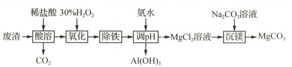 12 (6分)实验室以一种工业废渣(主要成分为$MgCO_3$,含少量$FeO$、$Fe_2O_3$、$Al_2O_3$)为原料制备$MgCO_3$。