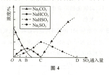 (4)①反应初期,少量SO₂与Na₂CO₃溶液发生反应,产物是Na₂SO₃和NaHCO₃,当SO₂量较多时,SO₂再依次与NaHCO₃溶液、Na₂SO₃溶液继续反应,产物依次是NaHSO₃、NaHSO₃。B点以前发生反应的化学方程式为2Na₂CO₃+SO₂+H₂O=2NaHCO₃+Na₂SO₃。②由图4可知,SO₂的通入量控制在C点时,Na₂SO₃产量最高。