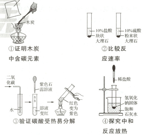 17.A 酒精燃烧也能生成CO₂,澄清石灰水变浑浊不能证明木炭中含有碳元素,不能达成实验目的,①错误;酸的种类、大理石的表面积均不同,变量不唯一,不能比较反应速率,不能达成实验目的,②错误;加热后,滴加石蕊的溶液由红色变为紫色,说明加热能导致碳酸的量减少,能证明碳酸受热易分解,能达成实验目的,③正确;NaOH固体溶解时也会放热,不能证明中和反应放热,不能达成实验目的,④错误;故选A。