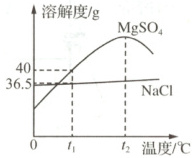 17.C 由图可知,t₁℃时MgSO₄的溶解度是40g,则MgSO₄饱和溶液的溶质质量分数=$\frac{40g}{100g + 40g}$×100%≠40%,A错误;由图可知,t₁℃时NaCl的溶解度是36.5g,即50g水中最多能溶解18.25gNaCl,则所得溶液的质量=50g + 18.25g≠70g,B错误;由图可知,将t₂℃时MgSO₄的饱和溶液升温或降温,溶质都会结晶析出,则溶质质量分数都会变小,C正确;由图可知,NaCl的溶解度受温度的变化影响较小,冷却热饱和溶液,基本不析出NaCl晶体,应该改用蒸发结晶法,D错误。