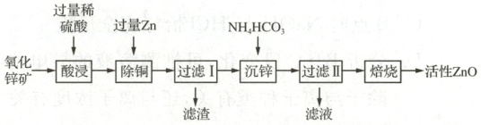 23 (6分)$ZnO$广泛地应用于药膏等产品的制作中。以氧化锌矿(主要成分为$ZnO$,还含少量$CuO$,其余成分不与硫酸反应)为原料制备活性氯化锌,流程示意图如图。