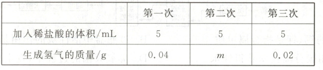 (8) 黄铜是铜和锌的合金($Cu-Zn$),可用来制造机器、电器零件及日用品。为了测定某黄铜样品中铜的质量分数(不考虑黄铜中的杂质),现将15mL稀盐酸分三次加入5g黄铜样品粉末中,每次充分反应后,测定生成氢气的质量,实验数据见下表:
