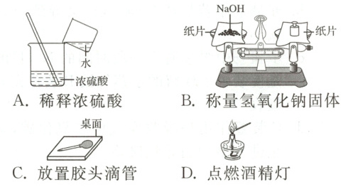 6.D 稀释浓硫酸时,应该“酸入水”,A错误;NaOH能腐蚀纸片,应用玻璃器皿称量,B错误;胶头滴管应竖直放置,不能横放或倒放,C错误。