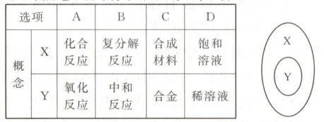 14.B 氧化反应不一定是化合反应,不存在图示关系,A错误;中和反应一定是复分解反应,存在图示关系,B正确;合金是金属材料,不是合成材料,不存在图示关系,C错误;稀溶液不一定是饱和溶液,不存在图示关系,D错误。