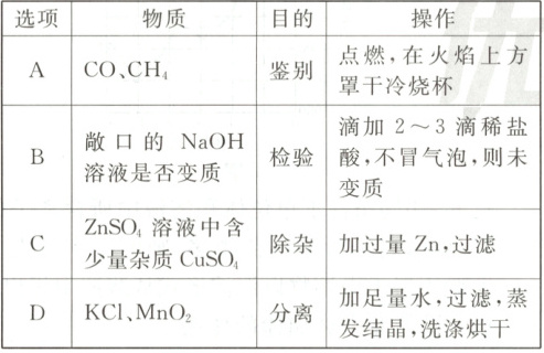 16.B CH₄中含有H元素,故干冷烧杯中有水雾的是CH₄,可以鉴别,A正确;NaOH溶液吸收空气中的CO₂会变质产生Na₂CO₃,滴加2~3滴稀盐酸,HCl优先与NaOH反应,Na₂CO₃因来不及反应而无气泡产生,不能检验,B错误;金属活动性Zn>Cu,Zn能从CuSO₄溶液中置换出Cu,过滤可除去Cu和过量的Zn,可以除杂,C正确;KCl可溶于水,MnO₂不溶于水,加足量水,过滤可得到MnO₂,滤液蒸发结晶,洗涤烘干,得到KCl,可以分离,D正确。