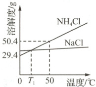 8.B 由图可知,NaCl的溶解度受温度的影响比NH₄Cl小,A错误;50℃时NH₄Cl的溶解度是50.4g,NH₄Cl饱和溶液中溶质的质量分数$=\frac{50.4g}{50.4g + 100g}×100%≈33.5%,C$错误;50℃时,100g水最多能溶解50.4gNH₄Cl,故将100gNH₄Cl固体加入100g水中,充分溶解后所得溶液的质量小于200g,D错误。