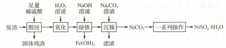 (5)NiCO₃转化为NiSO₄,可加入稀硫酸;由表格信息可知,要得到NiSO₄·6H₂O,需控制温度在30.8~53.8℃,故在蒸发浓缩后,应降温至30.8~53.8℃结晶,然后过滤、洗涤并晾干。