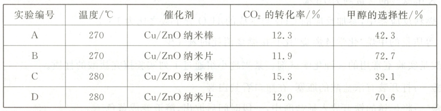 。③合成时,温度、催化剂对$CO_{2}$ 的转化率(数值越大,参加反应的$CO_{2}$ 越多)以及甲醇的选择性(数值越大,产物中甲醇占比越大)有较大影响。某实验室控制$CO_{2}$ 和$H_{2}$ 的初始质量比为10:1,在相同压强下,经相同反应时间测得如下实验数据: