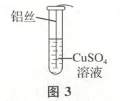 (3)丙组同学用砂纸将铝丝表面打磨光亮后,浸入$CuSO_{4}$ 溶液中(如图3),观察到铝丝表面有少量气泡,周围还出现少量蓝绿色物质;48 h后,铝丝表面出现少量红色物质。