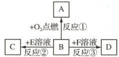 解析:B是目前世界上年产量最高的金属,则B为Fe;B和氧气点燃后生成A,则A为$Fe_{3}O_{4}$;C是密度最小的气体,C为$H_{2}$;B和稀酸反应可生成$H_{2}$,说明E中一定含有$H^{+}$;F的水溶液在农业上常用来配制波尔多液,F为$Ca(OH)_{2}$或$CuSO_{4}$,又因F能够和Fe发生置换反应生成单质,所以F为$CuSO_{4}$,得到的单质D为铜。