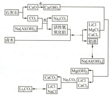 3. D 石灰石的主要成分是碳酸钙,高温分解生成氧化钙和二氧化碳,生成的二氧化碳也是提取碳酸锂流程中一个反应的反应物,则流程中石灰石的作用不能直接用生石灰来替代,A错误;在流程图中,$ Na[Al(OH)_4 ]$既是流程中某个反应的反应物,也是流程中另一个反应的生成物,且不是中间产物,可循环利用,$ Mg(OH)_2$不能循环利用,B错误;氯化钠的溶解度受温度的影响变化不大,宜采用蒸发结晶的方法除去氯化锂中氯化钠,但所得溶液为氯化钠的饱和溶液,蒸发结晶法不能将氯化锂中混有的氯化钠完全除去,C错误;每$100\ t$盐湖卤水制得碳酸锂$59.2\ kg$(锂元素的提取率为$80\%\sim92\%$),每$100\ t$盐湖卤水中最多含锂元素的质量为$59.2\ kg × \frac{7 × 2}{74} × 100\% ÷ 80\% = 14\ kg = 0.014\ t$,则该盐湖卤水中锂元素的质量分数最高为$\frac{0.014\ t}{100\ t} × 100\% = 0.014\%$,D正确。