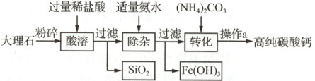 4. (2022泰州)高纯碳酸钙广泛应用于精密电子陶瓷、医药等生产。下图为模拟制备高纯碳酸钙的主要流程,已知该大理石中杂质是二氧化硅和氧化铁。下列有关说法错误的是(