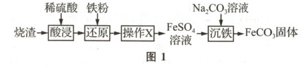用预处理后的硫铁矿烧渣(主要成分为${Fe_{2}O_{3}}$,含少量不溶性杂质)制备碳酸亚铁的流程如图1所示。