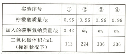 3. (2023无锡)柠檬酸(${C_{6}H_{8}O_{7}}$)能与碳酸氢钠反应生成二氧化碳。向4份等质量等浓度的柠檬酸溶液中分别加入一定质量的碳酸氢钠,充分反应,4次实验数据记录见下表: