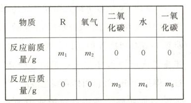 7. D 根据质量守恒定律,化学反应前后元素种类不变,$m_3=0$,$m_5=0$时,说明R和氧气反应生成水,则说明其中一定含有氢元素,A正确;若$m_1+m_2=m_3$,则说明R和氧气反应生成二氧化碳,则R中一定含有碳元素,可能含有氧元素,B正确;$m_3∶m_4=11∶9$时,说明R和氧气反应生成二氧化碳和水,则R中一定含有碳元素和氢元素,可能含有氧元素,C正确;$m_3$ g二氧化碳中,氧元素的质量为$\frac{16×2}{12+16×2}×100\%× m_3 g=\frac{8}{11}m_3 g$,$m_4$ g水中氧元素质量为$\frac{16}{1×2+16}×100\%× m_4 g=\frac{8}{9}m_4 g$,$m_5$ g一氧化碳中氧元素的质量为$\frac{16}{12+16}×100\%× m_5 g=\frac{4}{7}m_5 g$,若$\frac{8}{11}m_3+\frac{8}{9}m_4+\frac{4}{7}m_5=m_2$,则氧气中氧元素的质量等于生成物中氧元素的质量,则R中不含氧元素,D错误。