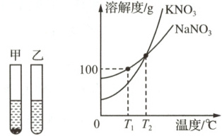 17 $T_{1}{° C}$时,分别向盛有10.0 g水的甲、乙试管加入等质量的${KNO_{3}}$和${NaNO_{3}}$固体,溶解情况如图所示。下列说法不正确的是 ()