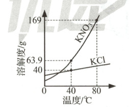 8.B 由图可知,温度不明确时,KNO₃的溶解度不一定大于KCl,A错误;40℃时,KCl饱和溶液中溶质的质量分数$=\frac{40}{100+40}×100%≠40%,$C错误;由图可知,将269g80℃的KNO₃饱和溶液降温至40℃时才能析出105.1g晶体,D错误。