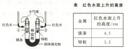(4)其他条件相同时,镁与稀盐酸反应使红色水面上升的高度比锌粒高