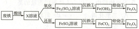 由废铁(主要成分是$Fe$、${Fe_{2}O_{3}}$)回收利用制铁红(${Fe_{2}O_{3}}$)的过程如下: